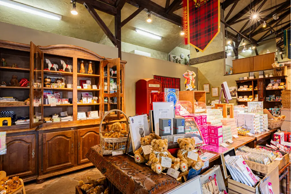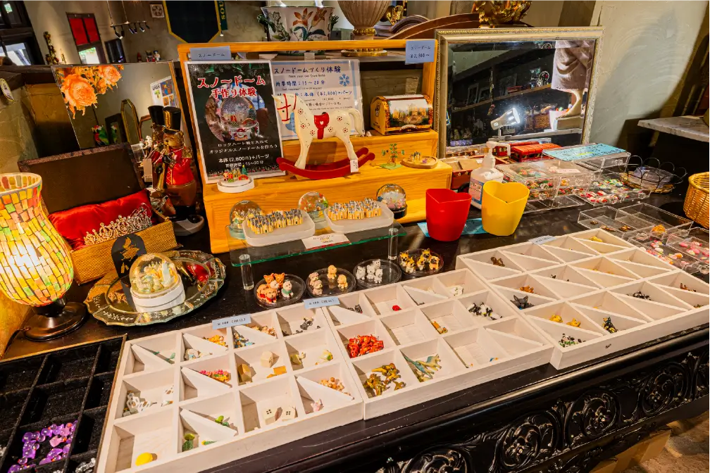 店内には、ヨーロッパ直輸入の雑貨やぬいぐるみ、きらめくパワーストーン、ここでしか出会えないロックハート城のオリジナルグッズが並び、まるで宝物を探すようなひとときを楽しめます。中でも、願いを込めて奉納できる名物のハート絵馬は、多くの人が手に取る人気のお土産。