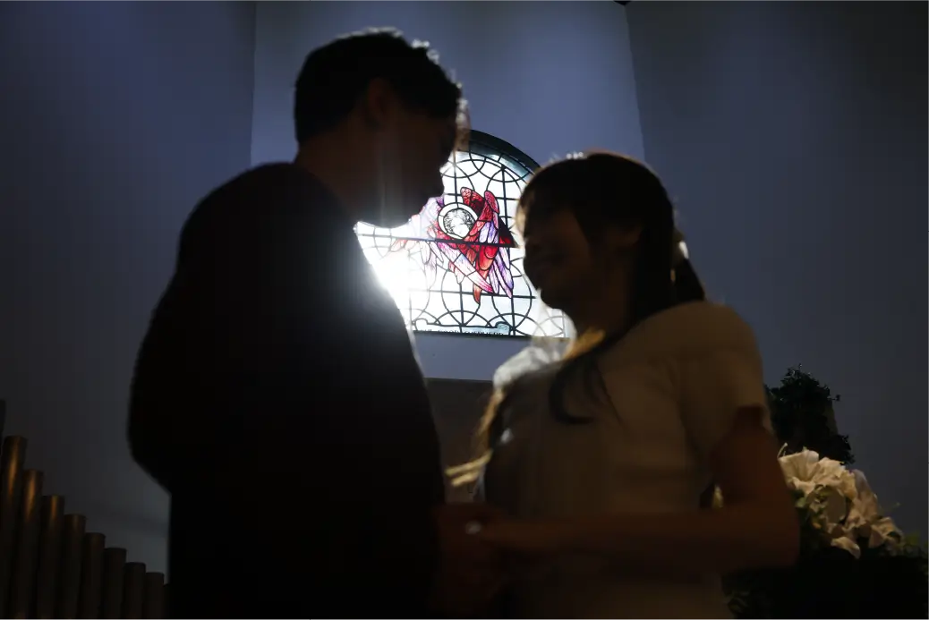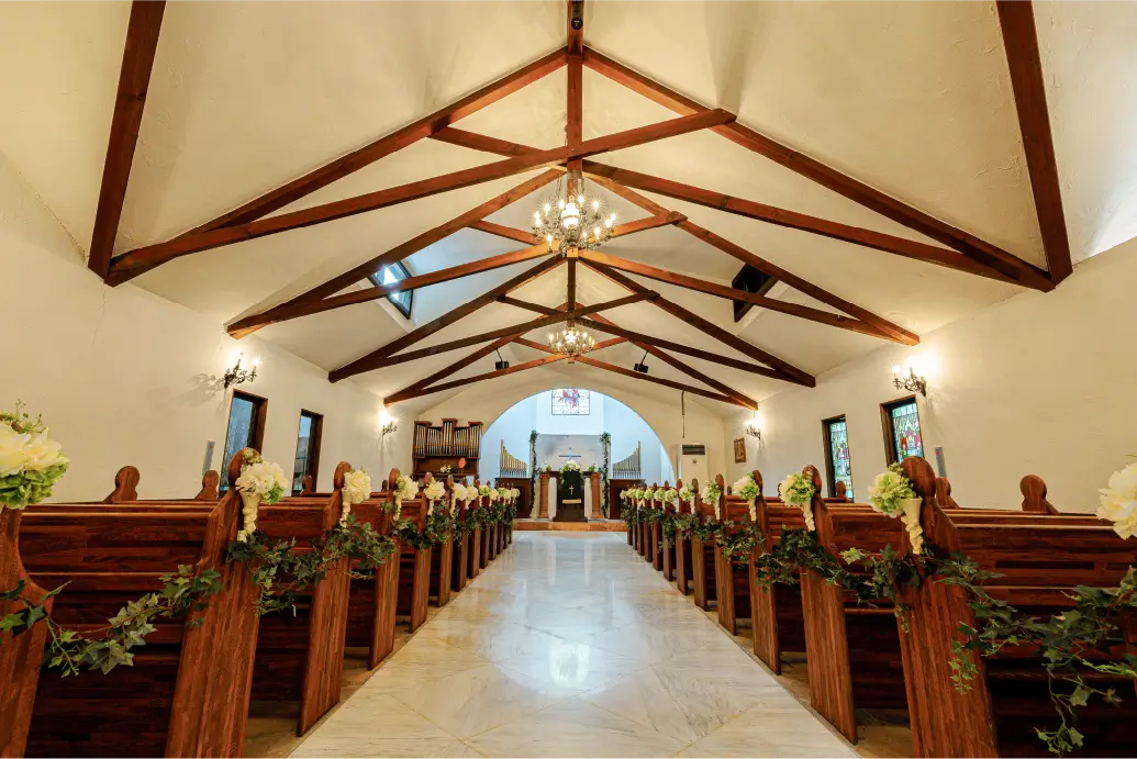 教会の内部では、18世紀のアンティーク・ステンドグラスがやわらかな光を映し出します。色彩に満ちた光が差し込むなかで行われる結婚式は、厳かでありながらも温かな感動に包まれる特別なひととき。
