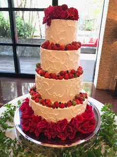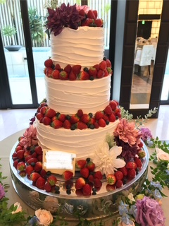 こちらも各層にイチゴを敷き詰めましたがトップ、アンダーにそれぞれお花のみで装飾をしました。またクリームでお二人のイニシャルをいれおしゃれさも演出しました!