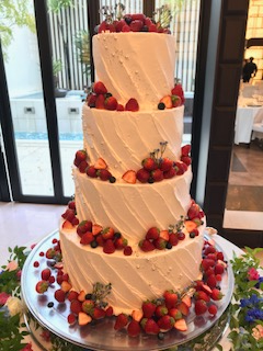 各層イチゴを敷き詰めこちらは斜めにクリームのラインをいれました。高さのある王道のウェディングケーキに!