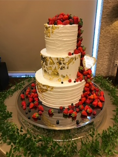 トップからイチゴが溢れており敷き詰められており金箔をそれぞれあしらいゴージャスにインパクトのある可愛いウェディングケーキ!