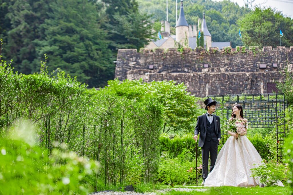 木漏れ日と森のリゾートウェディング風に。避暑地として知られる軽井沢は、緑のトンネルや森の中での前撮りが人気です!自然光がやわらかく差し込む森の中で、映画のような映像が撮れます。チャペル周辺や小径でのロケーション撮影は、ナチュラル派のカップルにぴったり!おすすめ時間帯:午前〜昼過ぎ(やわらかい自然光)