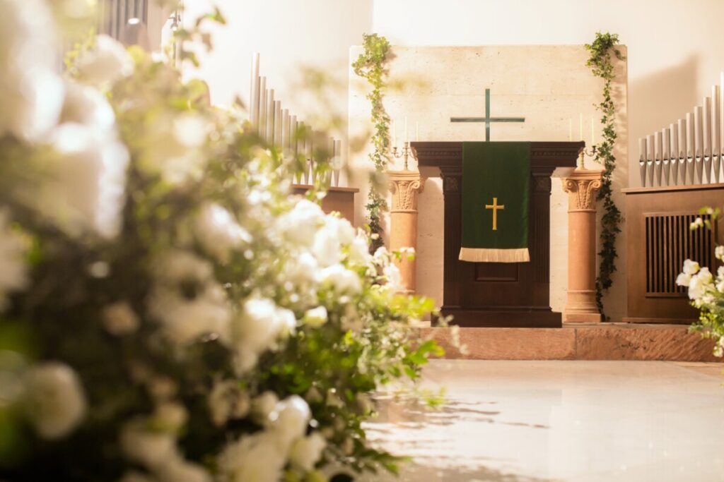 ピューエンズ」とは、結婚式の際に教会やチャペルのバージンロード沿いに並ぶベンチ(ピュー)の端に添えられる装花のこと。**“天使の足跡”**とも呼ばれ、新郎新婦を悪いものから守り、天使がそっと祝福しているという想いが込められています。